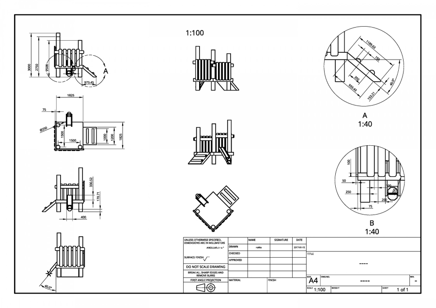 Ein weiterer Auftrag bestand darin, bestimmte Spielgeräte als Konstruktionsskizze bzw. 3D Modell zu visualisieren und somit besser reproduzierbar zu machen. Ich habe dafür mit Fusion360 einige Entwürfe gemacht, die sogar bemaßt sind und in verschiedenen Ansichten gerendert werden können. Für visuellere Renderings nutze ich Cinema 4D.